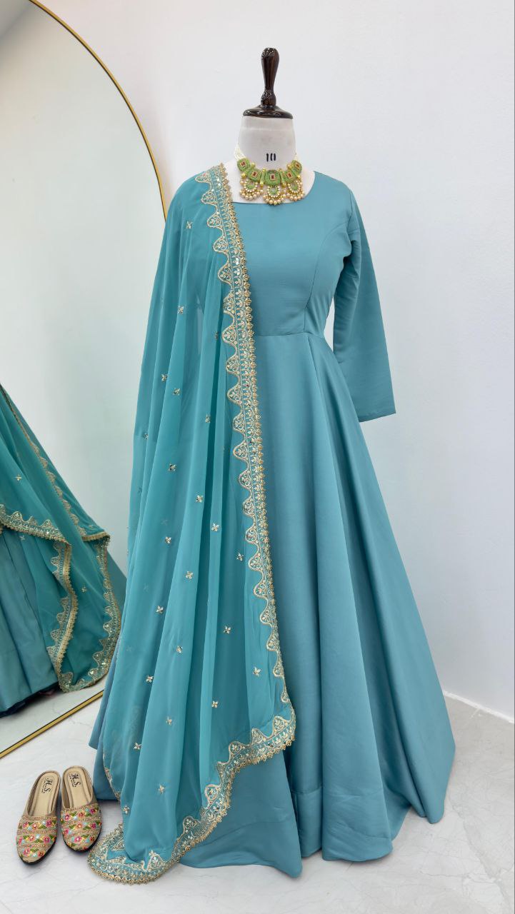 Complementing the gown is a gorgeous Fox Georgette Dupatta, adorned with intricate sequin coding embroidery that adds a touch of sparkle and sophistication. The dupatta measures 40 inches in length and 2.20 meters in size, making it the perfect accessory to complete your graceful look.