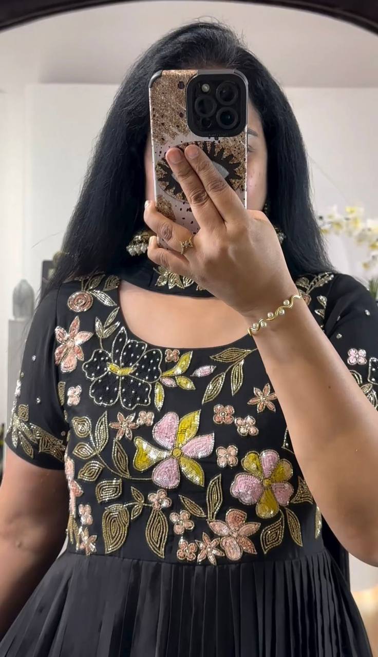 Grace meets elegance in this stunning Black designer gown, crafted from luxurious Faux Georgette fabric with a soft micro inner lining for ultimate comfort. Adorned with delicate thread embroidery and shimmering sequin work, this gown is a perfect blend of tradition and modern style, making it an ideal choice for festive occasions, weddings, and special celebrations.