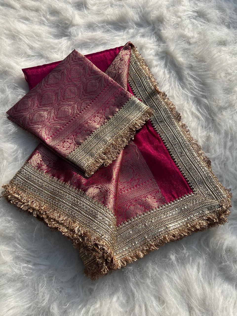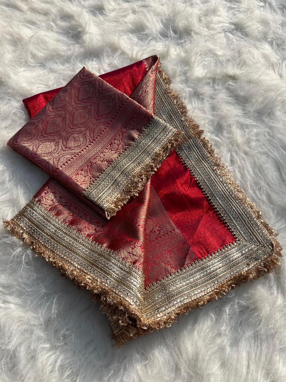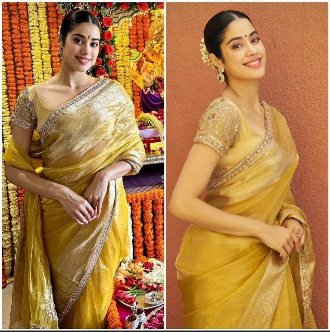 Elevate your ethnic elegance with the Jahnvi Kapoor Tissue Saree, a masterpiece that beautifully blends tradition with contemporary grace. Crafted from luxurious tissue fabric, this saree radiates a subtle shimmer, exuding sophistication and royal charm. The intricate golden zari border with delicate fringes enhances its opulent appeal, making it an ideal choice for weddings, festive occasions, and grand celebrations.