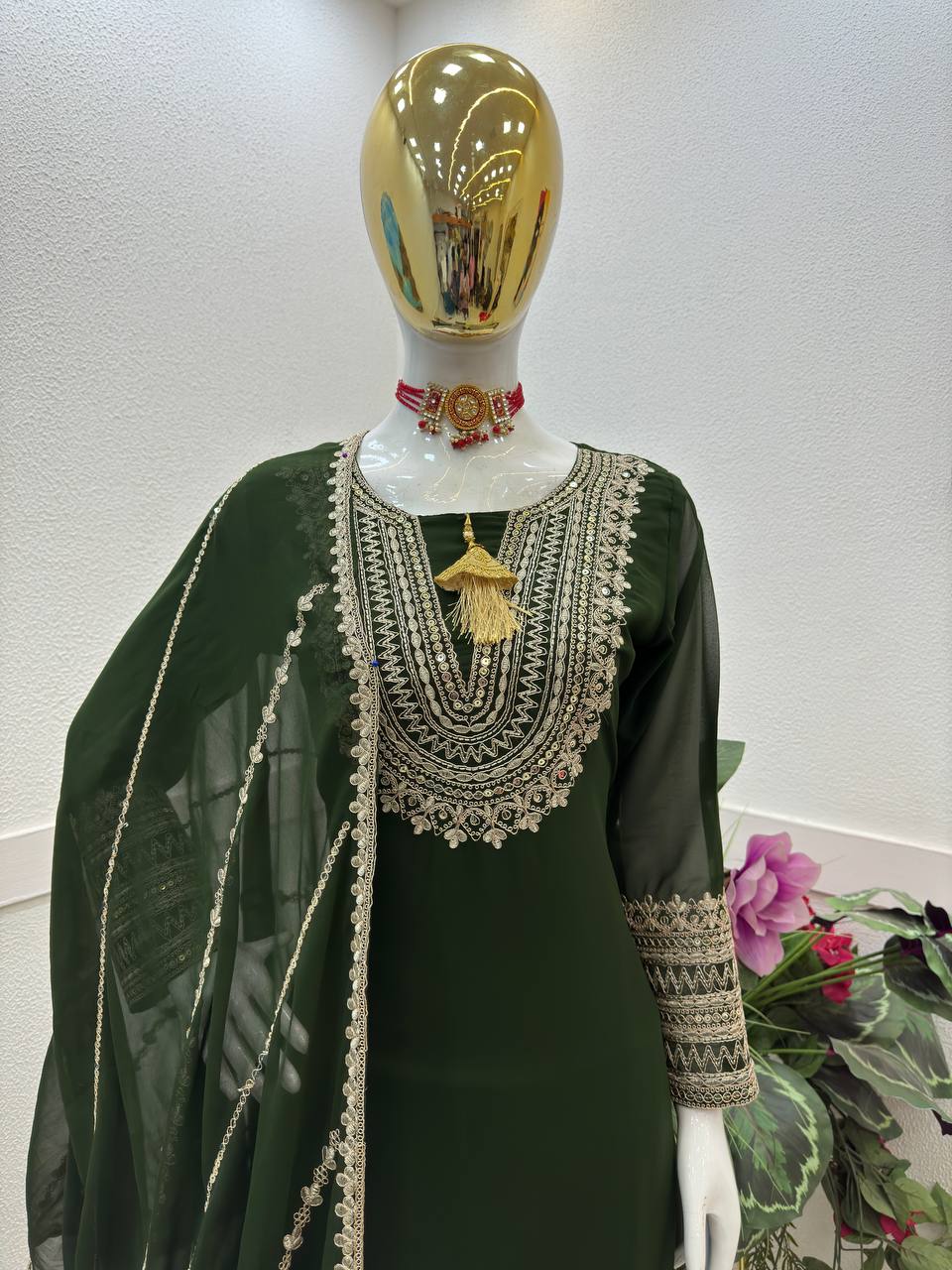 Make a bold and beautiful statement with this Green New Designer Party Top, Palazzo & Dupatta Set, designed to add a touch of glamour and elegance to any special occasion.