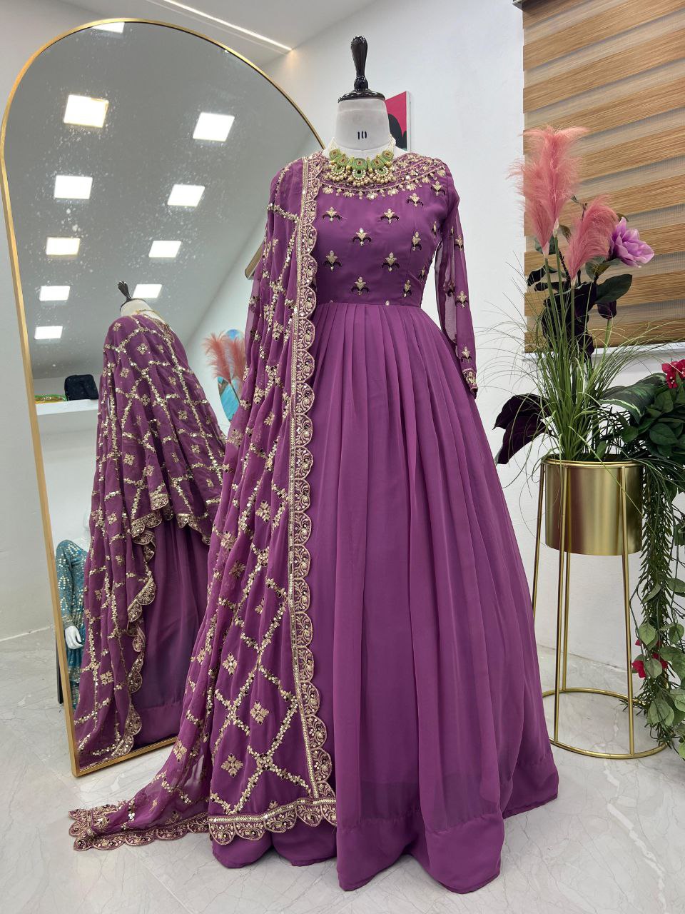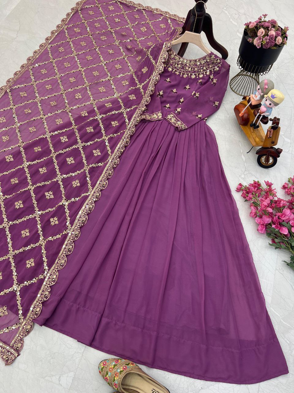 Brighten up any occasion with this Radiant Purple Gown, crafted from premium Fox Georgette fabric and embellished with dazzling sequin embroidery for a glamorous touch. This gown features a soft micro inner lining for all-day comfort, along with a convenient zipper and padding for a flawless fit. The flowing silhouette, with a dramatic 4-meter flair and a graceful 58-inch length, ensures you’ll turn heads wherever you go. Available in sizes M, L, XL, and XXL to flatter every figure.